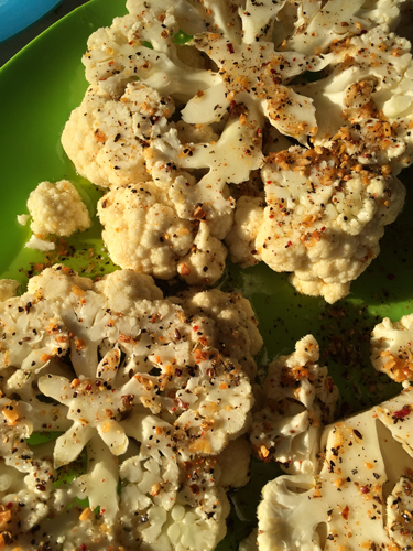 - Mix steak spice seasoning and smoked paprika seasoning and sprinkle generously the cauliflower steaks.