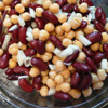 Rinse and drain the beans and chickpeas before preparation. Use a large salad bowl to combine the ingredients. Add the chickpeas, white kidney beans, and red kidney beans. Chop onion and add to the bowl.